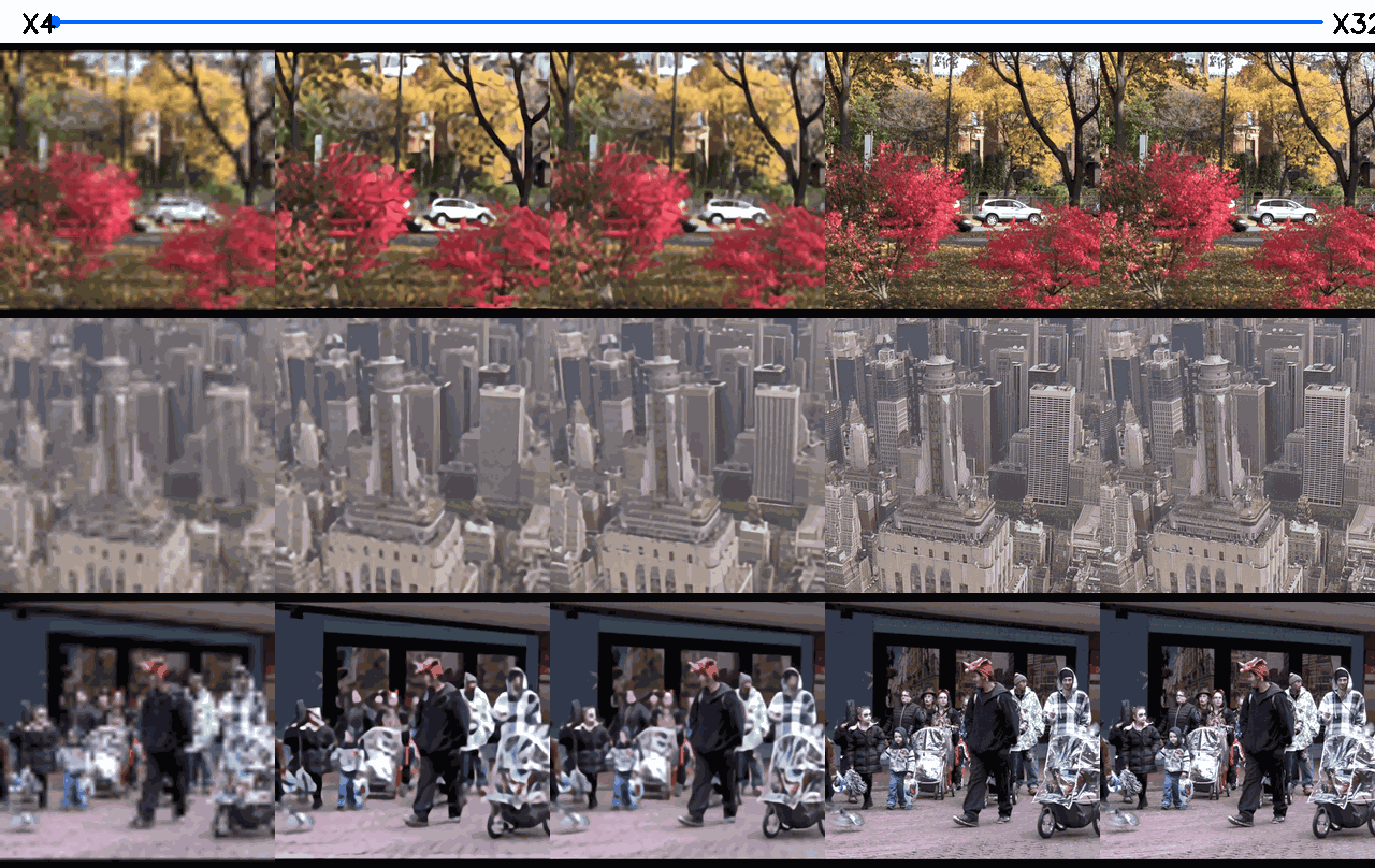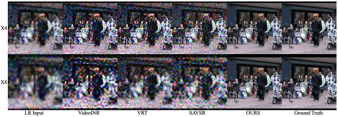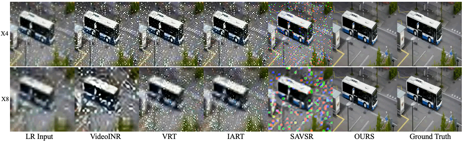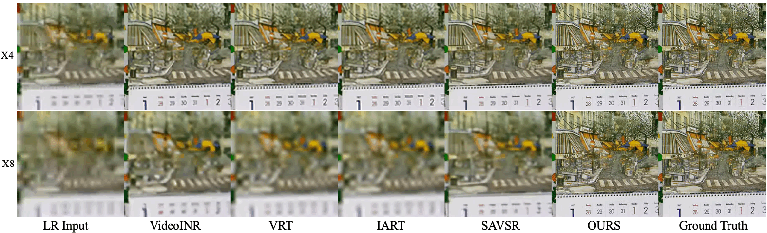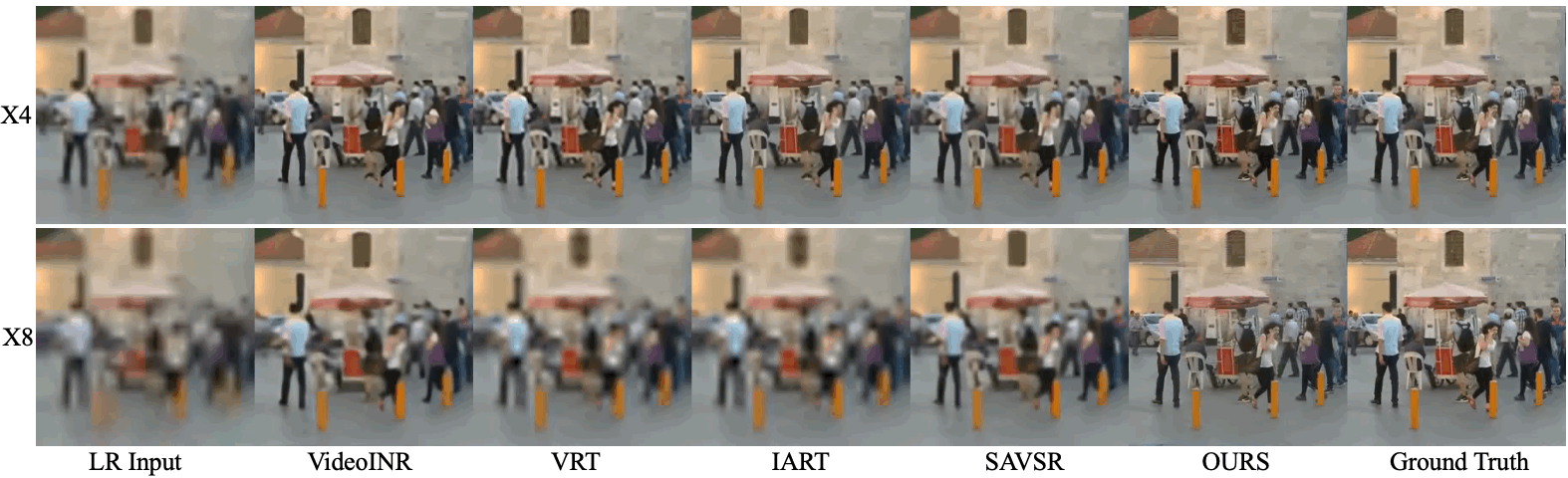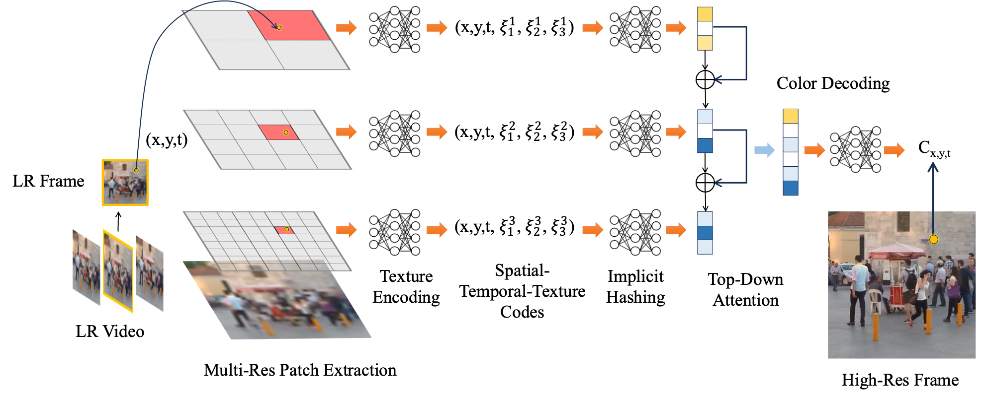 We propose VR-INR, a novel video restoration approach based on Implicit Neural Representations. VR-INR is trained only on clean data for super-resolution but generalizes effectively to arbitrary, unseen super-resolution scales at test time. Given an input sequence of low-resolution (LR) video: \(\{\mathbf{I}^{\text{LR}}_{t}|t = 1, 2, \ldots, T\}\) (where \(T\) is the total number of frames, and \(\mathbf{I}^{\text{LR}}_{t}\) represents a LR frame in the video) and a high-resolution grid \(\mathbf{r}^{\text{HR}}\in\mathbb{R}^2\) specifying the spatial coordinates, VR-INR aims to produce high-resolution (HR) videos \(\{\mathbf{I}^{\text{HR}}_{t}|t = 1, 2, \ldots, T\}\) . First, we employ hierarchical texture encoding network to extract and encode multi-scale local patches into spatial-temporal-texture feature representations \(\mathbf{F}_{\text{STT}}\). For each target high-resolution coordinate \(\mathbf{r}^{\text{HR}}\) at frame \(t\), we retrieve a compact set of neighboring feature vectors from a spatial hash table using implicit hashing, and efficiently interpolate these vectors using adaptively learned weights to generate robust implicit features \(\mathbf{v}^l\) . We then integrate these multi-resolution features \(\{\mathbf{v}^l\}_{l=1}^L\) through a top-down attention mechanism, which sequentially refines and combines feature representations from coarse to fine resolutions. Finally, we decode the consolidated feature representations \(\mathbf{v}^{\text{HR}}\) into RGB values using a multi-layer perceptron (MLP), generating the final HR video frames \(\mathbf{I}^{\text{HR}}_{t}\).